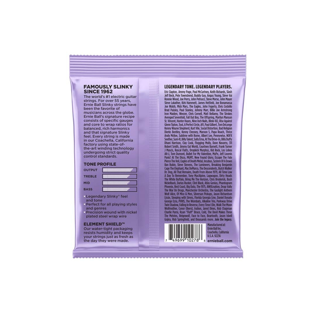Η εταιρία Ernie Ball είναι πρωτοπόρος στις χορδές Rock and Roll ηλεκτρικής κιθάρας. Από τότε που καθιέρωσε τα βιομηχανικά standards όσον αφορά τις χορδές ηλεκτρικής κιθάρας, η λίστα των χρηστών Slinky μεγαλώνει συνέχεια έχοντας ήδη κορυφαίους μουσικούς όπως οι EricClapton, JimmyPage, AngusYoung, Slash, JohnMayer, JohnPetrucci, SteveLukather, SteveMorse και SteveVai. Εάν σας αρέσει ο τόνος, σας αρέσουν οι Slinkys! Οι ντυμένες (τυλιγμένες) χορδές είναι από μίγμα επινικελωμένου ατσαλιού τυλιγμένου γύρω από ένα επικασσιτερωμένο, εξαγωνικής διατομής, ατσάλινο πυρήνα. Οι γυμνές χορδές κατασκευάζονται από ειδικής σύνθεσης κράμα ανθρακούχου ατσαλιού, που κατόπιν γαλβανίζεται (καλύπτεται με κασσίτερο). Μακράν οι πιό δημοφιλείς χορδές, παράγουν ισορροπημένο και all around εξαιρετικό τόνο.