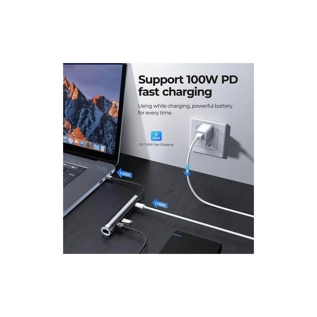 Είναι ένα κομψό προϊόν υψηλής ποιότητας το οποίο είναι κατασκευασμένο από αλουμίνιο. Επιπλέον διαθέτει ιδιαίτερο σχεδιασμό χάρη στον οποίο, περιστρέφοντας το επάνω μέρος στο όποιο βρίσκεται η θύρα RJ45, καλύπτονται οι θύρες όταν δεν χρησιμοποιείται. Το design και η αίσθηση του μεταλλικού υλικού της κατασκευής δίνει ιδιαίτερο τόνο στο γραφείο σας, ταιριάζοντας αρμονικά με τις υπόλοιπες συσκευές σας. Στην συσκευασία συμπεριλαμβάνεται τσαντάκι μεταφοράς.-Υποστηρίζει ταχεία φόρτιση PD με μέγιστη απόδοση 100W